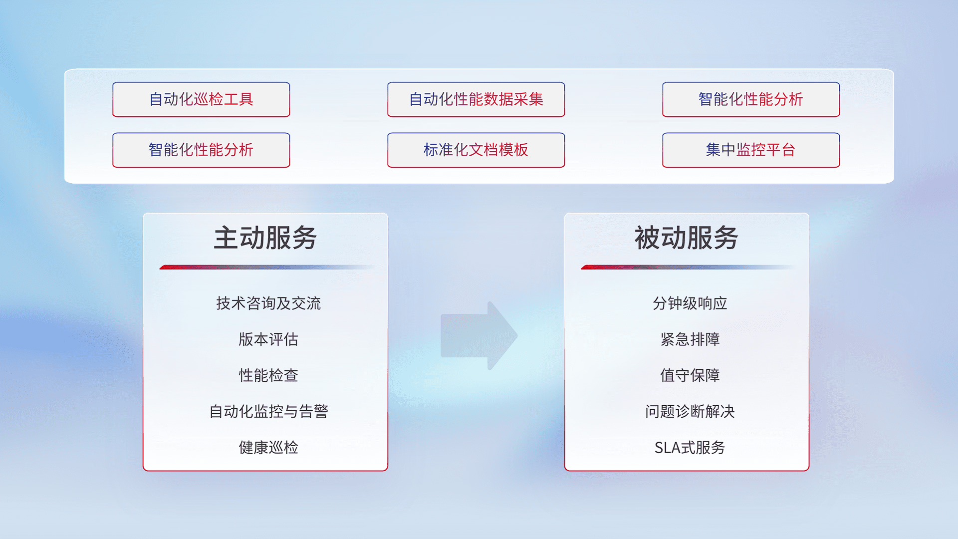 智能化工具和标准化文档,,保障服务质量,,,提供主动服务(包含技术咨询、、、版本评估、、、性能检查、、、、自动化监控与告警、、、健康巡检)和被动服务包含(分钟级响应、、、紧急排障、、、、值守保障、、、问题诊断解决、、SLA服务)。。。。