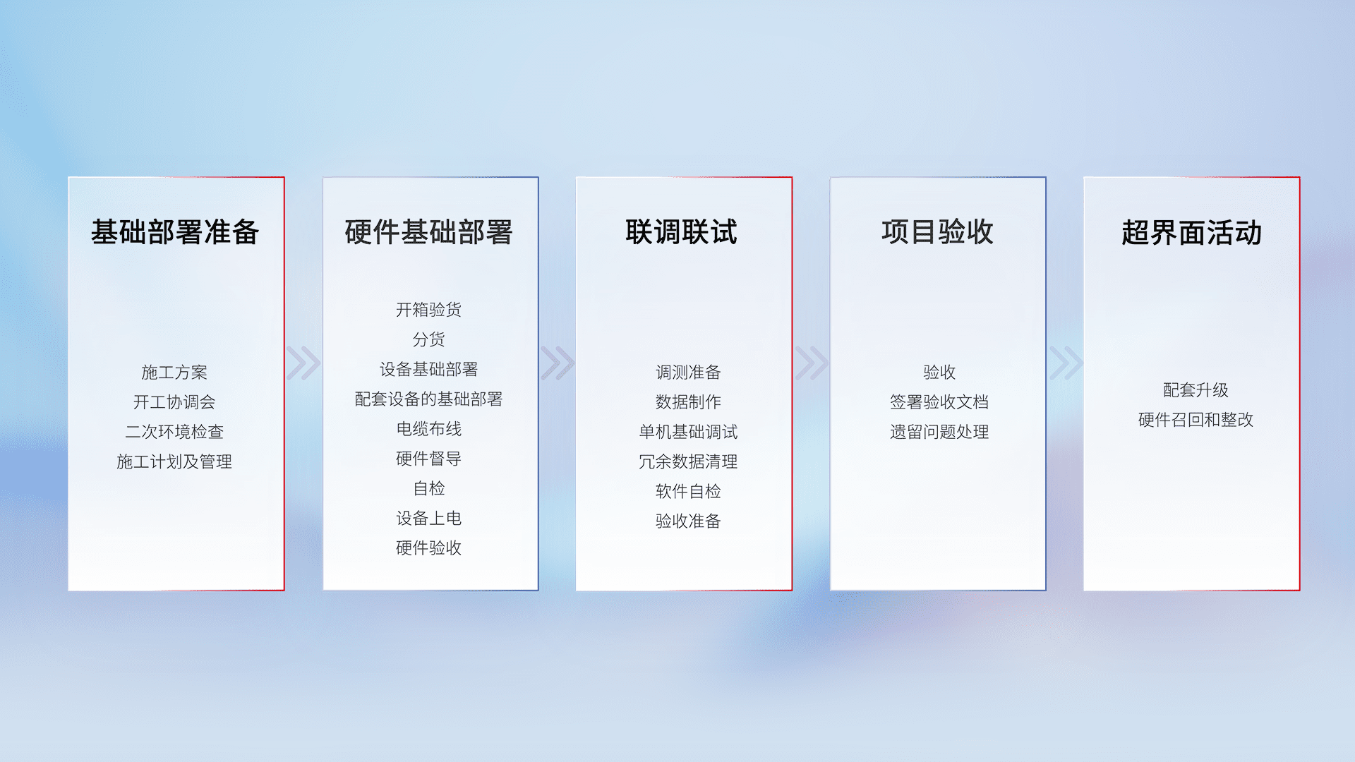 从基础部署准备、、、硬件基础部署、、、联调联试、、、项目验收、、越界面活动的全过程可追溯,,,保证施工质量和进度。。